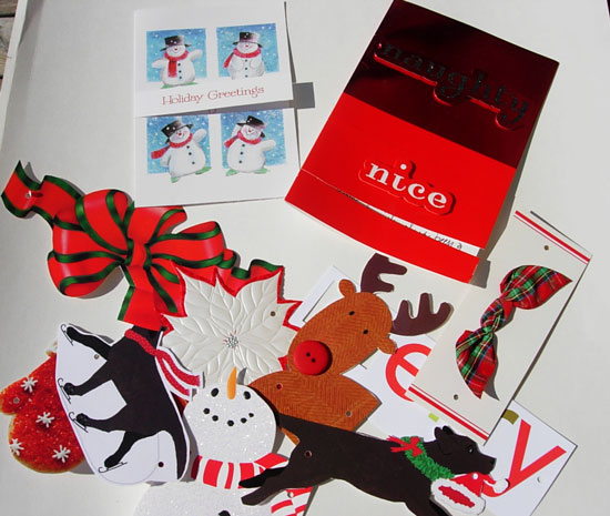 1. Cut greetings and images from the front of cards until you have enough to make a garland the length you need. Cut the images out in all different shapes for more interest. I chose to make my garland red, green, and white and only used cards in those colors.
