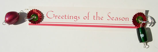 The recycled christmas card garland is quite easy to make. First you need to figure out how long a garland you want. Estimate how many cards, sequins, beads, and jump rings you will need, then begin creating it in stages. 1. Cut the cards. 2. Punch holes in sequins and put on jump rings. 3. Make wire loops for the beads 4. Assemble it.