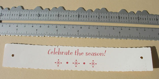 4. I used a deckle edge ruler to give my cut out greetings a decorative edge. You could also use pinking or scalloped scissors. Punch a hole in each side of the cut-out.