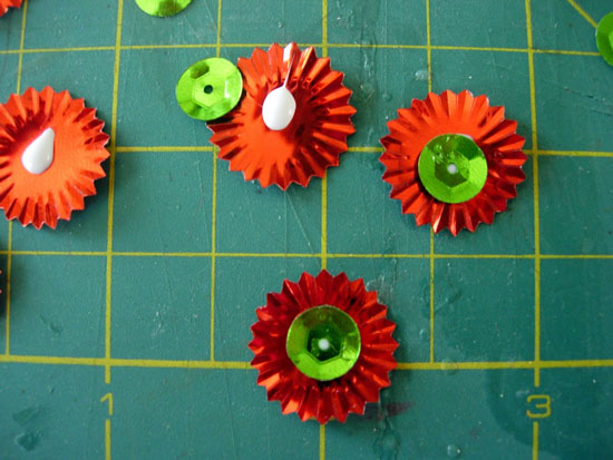 This step is optional, but I wanted to add a little glitz. I layered a green sequin onto a red one and used Fast Grab Tacky Glue to adhere quickly.