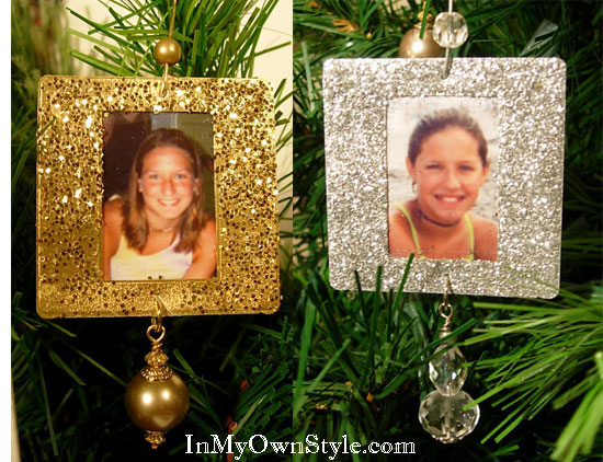 Handmade Christmas Ornaments to make. Glittery photo Christmas tree ornament ideas.