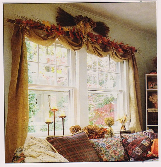 Learn how to use natural elements such as a tree branch as a rustic curtain rod as well as where to buy all colors of burlap to create a vibrant, yet simple burlap valance to DIY made burlap curtains for a more traditional style of fall decor.