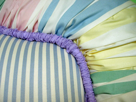 Stapling down the paper twist cord holds the foam and batting down evenly. If I didn’t use it, there would be a pouf indentation between the staples that would make the headboard look unprofessionally done. I didn’t sew the ruching as it was a no-sew project from the decorating book I wrote called Instant Decorating. BH&G (the publisher) wanted it to be all no-sew.