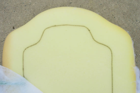 2. Cover board with foam, staple excess to back. Draw the shape again with a magic marker to show where the padded center starts.