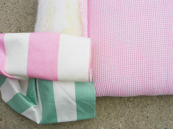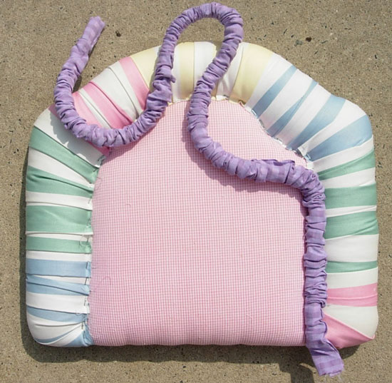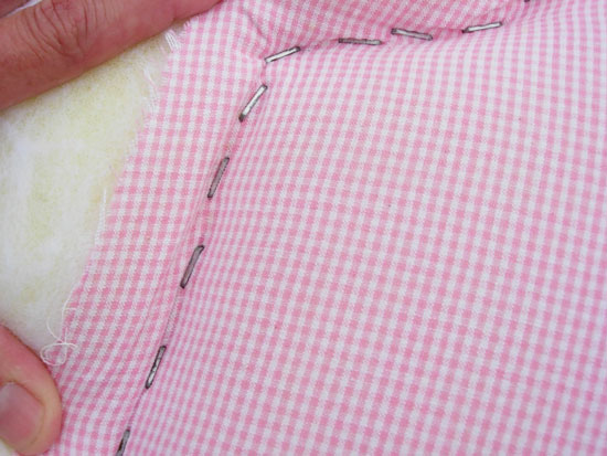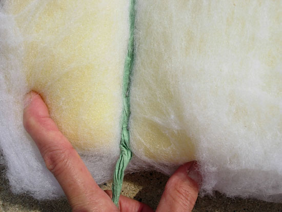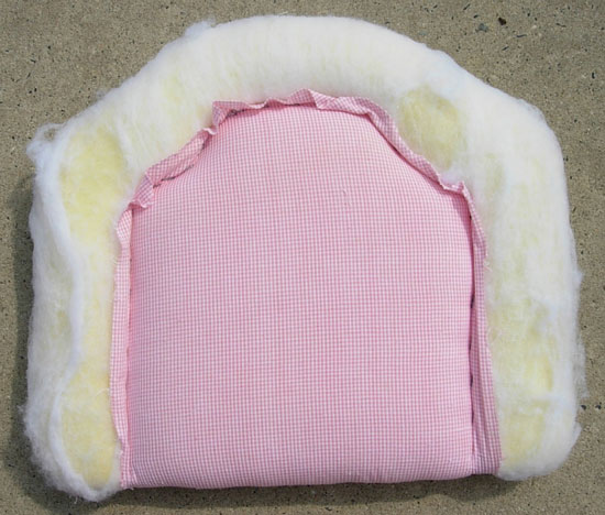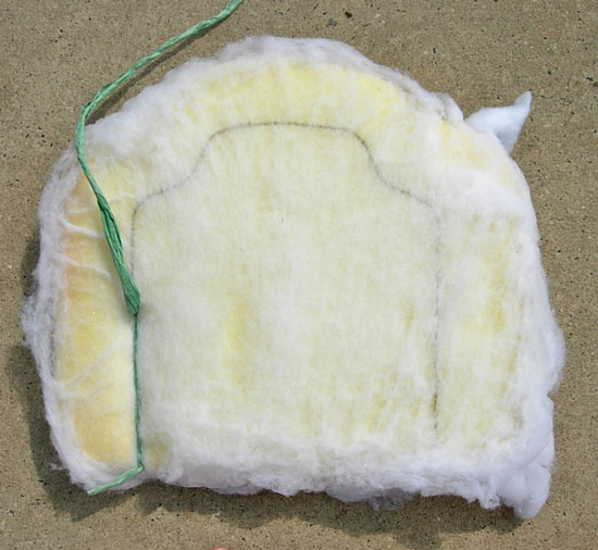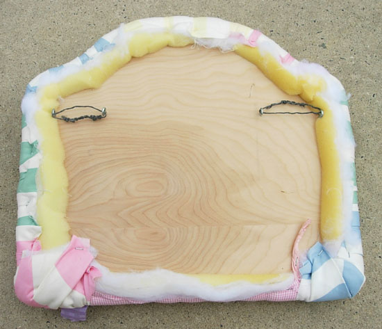 3. Cover with quilt batting, staple to back. I unraveled twisty cord slightly and layed it on top of the marked lines. Staple this cord all along the line. This starts the depression in the foam between the sides and center. Excess cord can be cut off.