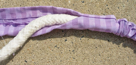 8. Run the hot glue in the channel and then press the cord, seam side down into the channel.