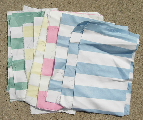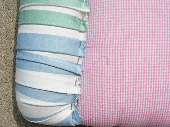 5. Instead of covering the border with just one piece of fabric, I opted to cover it with four different striped fabrics. Each color fabric was cut into pieces, then placed and stapled to the headboard consecutively to achieve the rainbow effect.