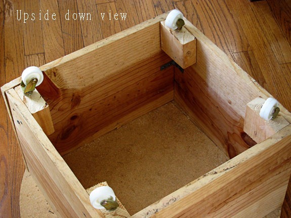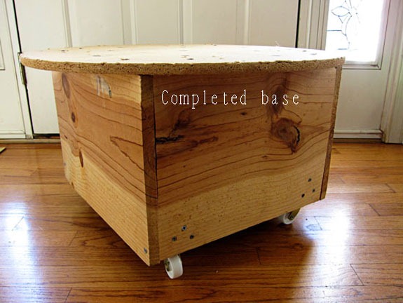 This is what the ottoman I built looks like after the fabric and foam top were removed. Decorator table top is used as the top of square base. Wheels attached to bottom of base.