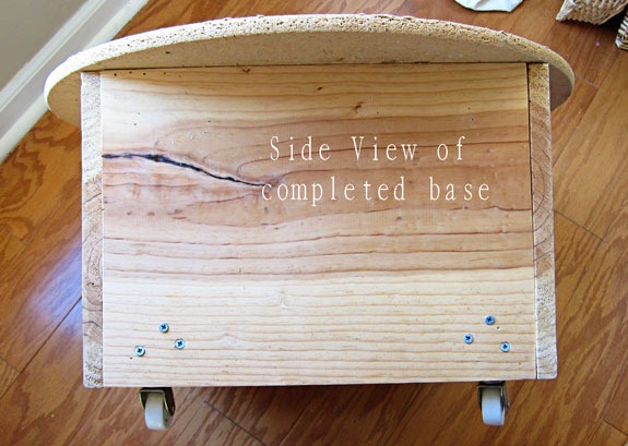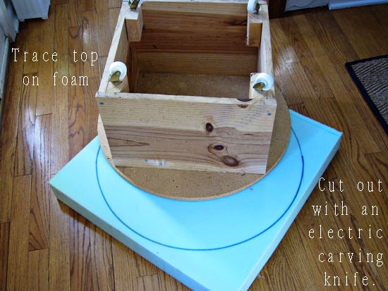 Lay the foam on the floor and place the base upside down on it. Trace the outline of the top and then cut out using an electric kitchen knife that you use at Thanksgiving to slice the turkey. *I have a more detailed post about cutting and buying foam here.