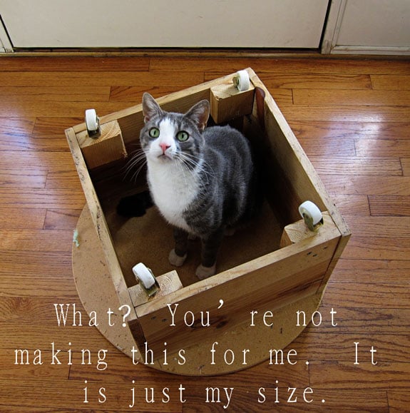 Hi Diane, I love your cat picture! Exactly what my angel kitties would have done! Have you considered making this ottoman with storage? In looking at the construction, it seems it would be a possibility by adding a square board inside that would rest on the 4 corner caster supports, nailed of course. And then adding hinges to the top round piece? Not sure if it would work without actually doing it. Great tutorial!!