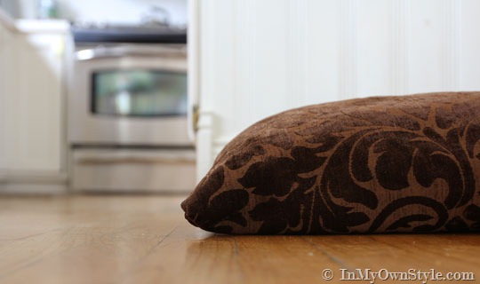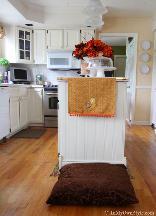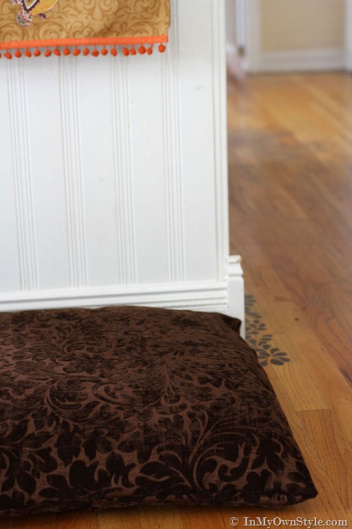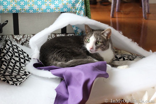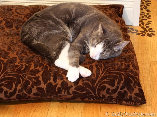 They all like hanging out in the kitchen on an extra pillow from the sofa I placed on the floor for them. They liked it, but it didn’t look as nice as it could, so I went to JoAnns Fabrics and bought a remnant of pretty fabric that will not only look good in my kitchen this Fall, but will be soft and snugly for snoozing.