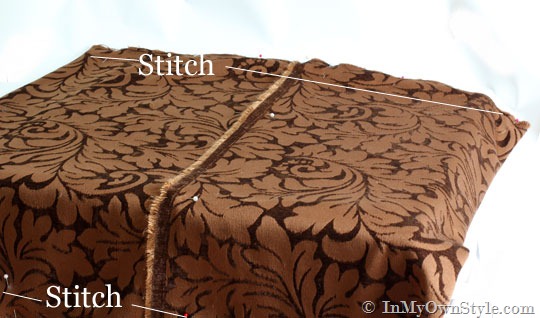 3. I laid the fabric on my worktable right side up. I then brought each side (selvages) of the fabric to the center. Where the selvages meet will be the pillow cover opening to allow me to take the cover on and off to wash. I pinned each side and sewed a seam down each.