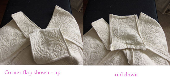 Since I pieced the skirt I needed to cover the ottoman where the skirt sides meet: I sewed a small rectangular piece of quilt to the seam on each corner.