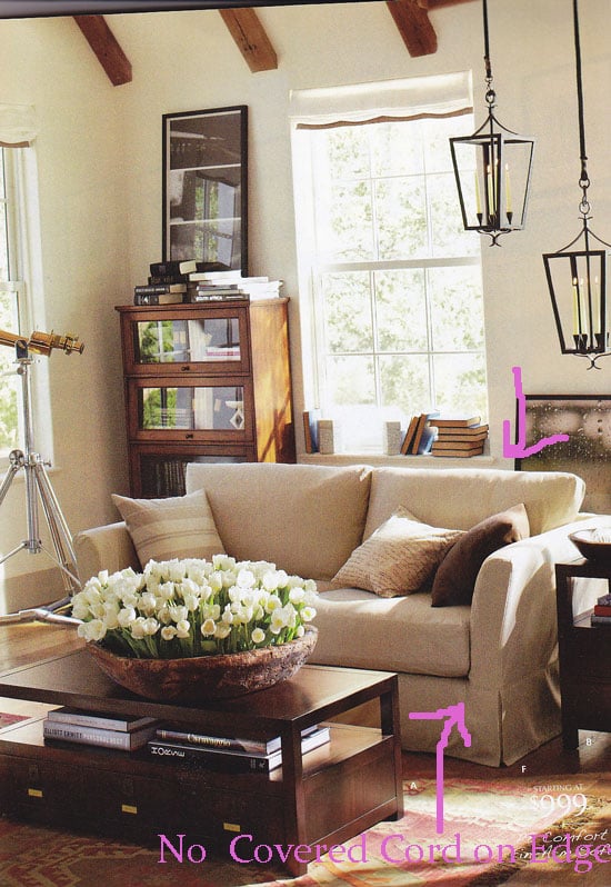 What caught my eye wasn’t the actual Pottery Barn sofa or fabric but the trim detail – more specifically that there was none – no covered cord along the cushion and pillow edges. It looked so modern and fresh. I wanted that look for slipcovers I am customizing for my family room.