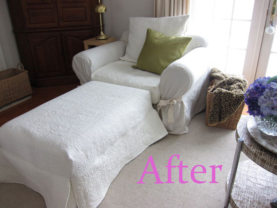 I just want to tell you that your ottoman looks so much better than the chair. NOW you should get a quilt to cover the chair to match! It would look like a million bucks! Great job!