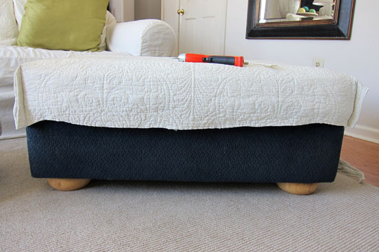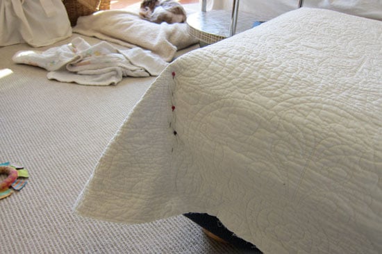 Wash the quilt first for shrinkage. Once dry and shrunk, I draped a quilt on top of the ottoman and pinned each corner as shown.