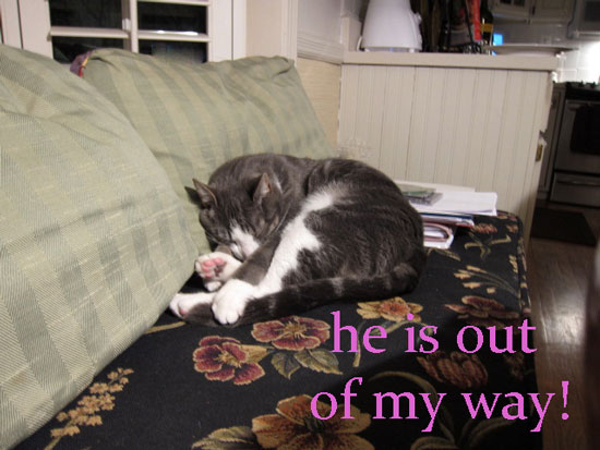 He thinks he is the King and this ottoman is his throne. I cannot tell you how many times I scooted and pushed him off. Finally I gave up.