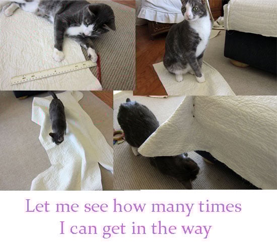 What a great idea to use a quilt it looks like matlesse! I hate making cording. My cats always have to sniff anything new, to cute!