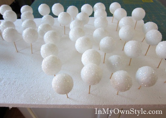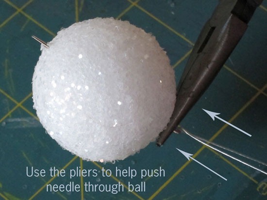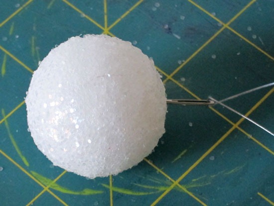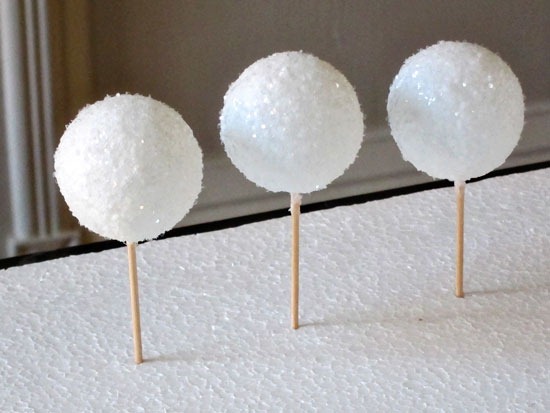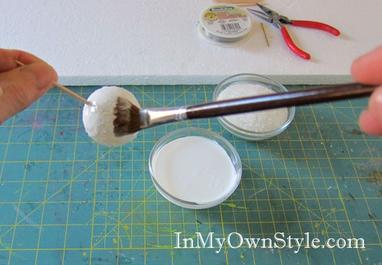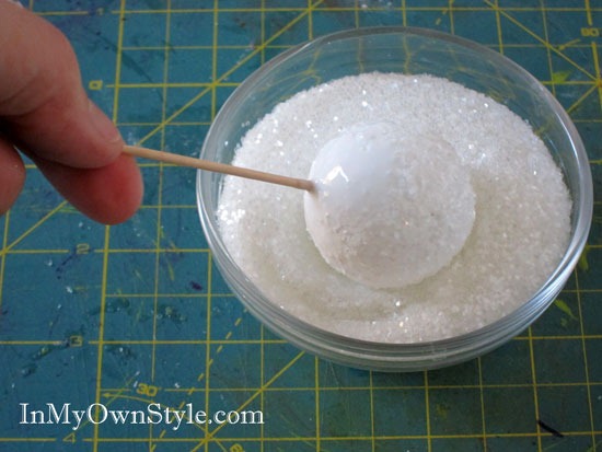 3. Roll the glue-covered ball in the glitter. You may have to use a spoon to make sure you get the entire ball covered especially around the toothpick.