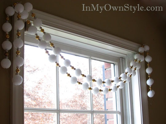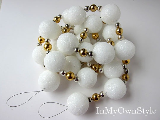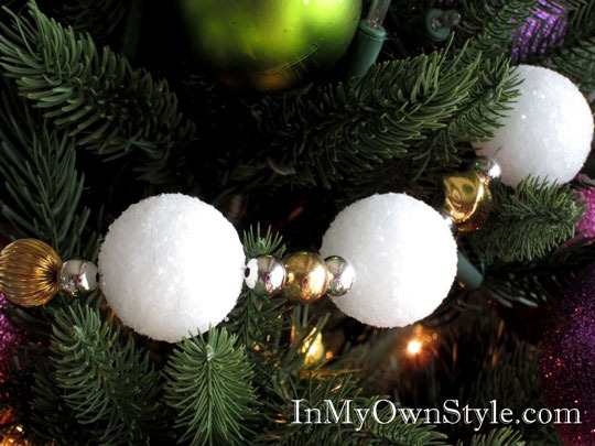 I got the idea for this garland out of a 1974 Better Homes and Gardens Christmas decorating book I found at a thrift store. I loved how simple the white balls looked on the tree – such a fun and festive contrast.
