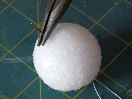 3. Use the pliers to pull the needle out from the opposite side. Add 3 beads to the stringing wire and then add another ball. Repeat until you get to your desired length.