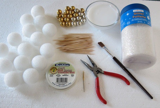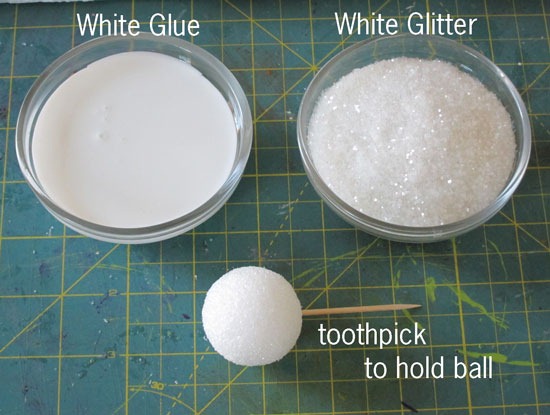 1. Pour glue and glitter each into separate bowls. Spear a ball of STYROFOAMTM Brand foam on a toothpick.