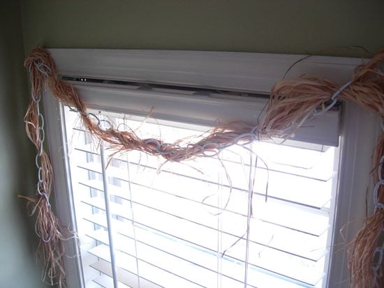 Hang the raffia and chain on the nails, making sure ends fall evenly on each side of the window.