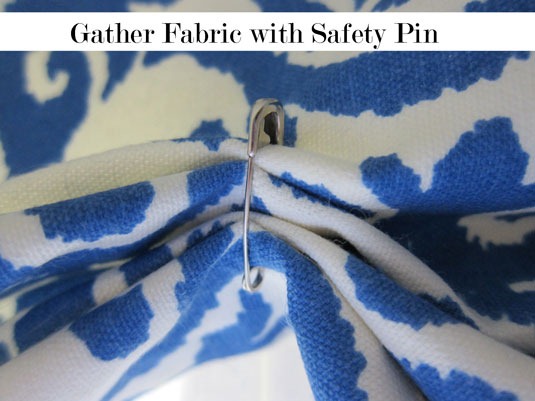 4. With your hands gather the fabric on each side and use the medium size safety pin to secure.