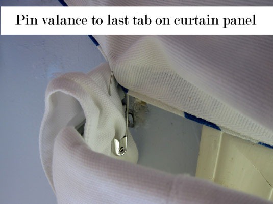 2. Spread the fabric to each side and use a safety pin to attach each end of the valance to the last tab or section of the curtain panel that is closest to the wall.