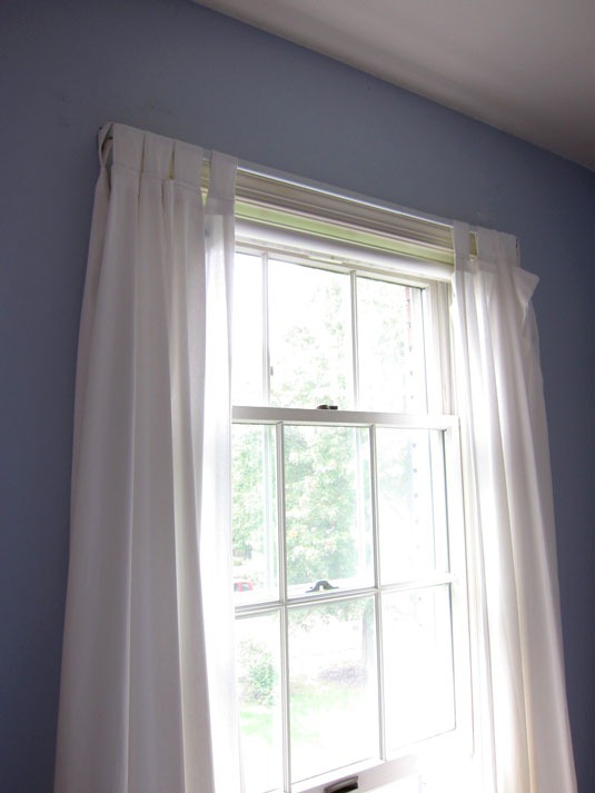 I removed my summer tablecloth valance that used to cover up the conventional rod and the tabs on the curtain panels that I bought at Target. I needed to come up with something pretty, yet simple that would cover the rod and tabs again.