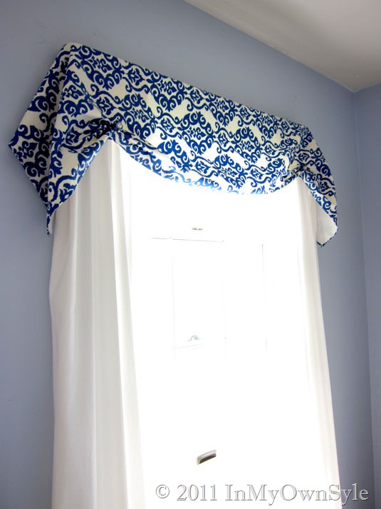 No sewing required. My valance measures 65″ x 22″. This might be a better way to figure out how much fabric you will need. Width of window + projection of rod x 2 + depth you desire = width of fabric needed. Example of my measurements: 37 + 6 + 22 = 65″ width.