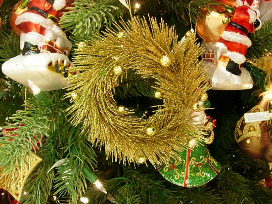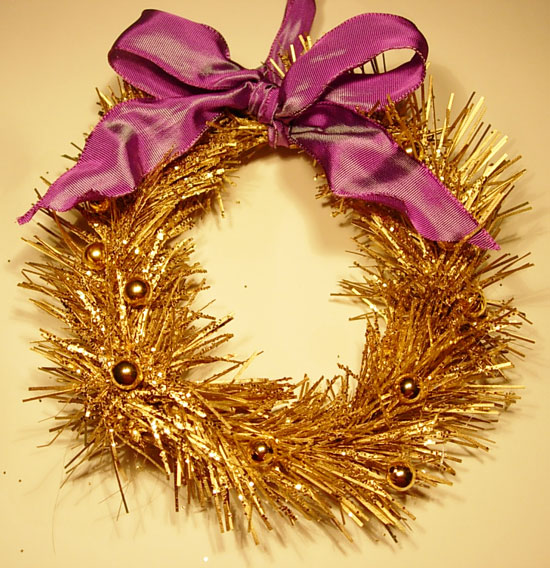 4. Once dry, hot-glued gold beads to resemble ornaments and then tie a ribbon onto it to hang.