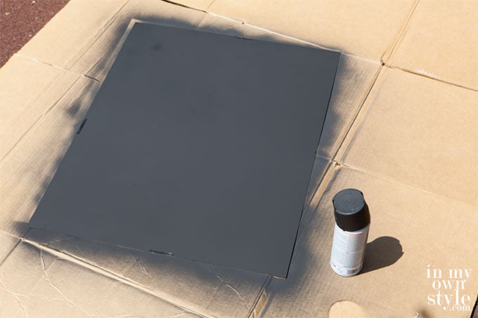 5. Make sure the acetate is clean and dry, then use spray chalkboard paint to paint the acetate. Spray on in long sweeping motions. Wait 5 – 7 minutes and then respray. Repeat until you get full coverage.