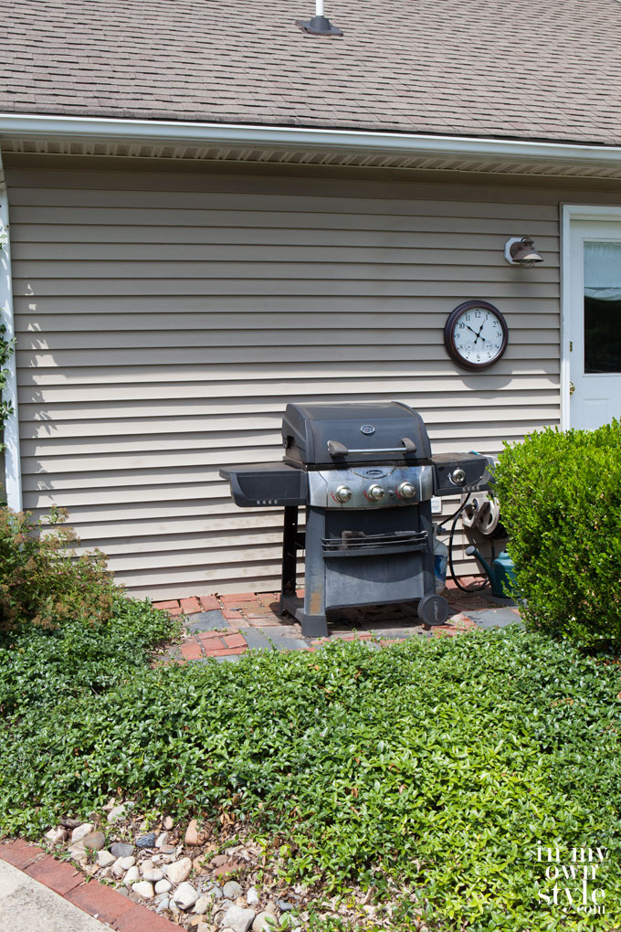 This post is long overdue, but one that I am so excited to have completed. If you remember back in the beginning of the summer I showed you my backyard in a summer home tour. I left out the space where we grill because it was bland and void of any decoration. I can now show you what I did. We keep our pool open as long as possible since it has a hot tub attached. We use it every weekend, but once Halloween rolls around – we have to close it up and store everything we keep outside for winter.