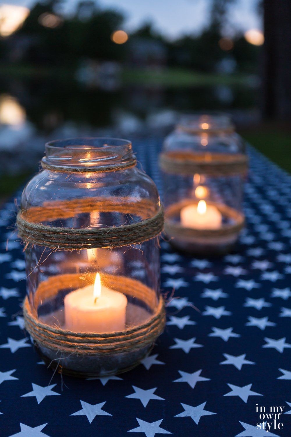 I could have used the jars simply “as is” to create plain glass candle lanterns. Living along the shores of a lake, I decided to give the pair of candle lanterns a nautical vibe with some sisal rope I had in my garage.