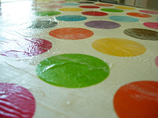 For instance, I centered one full piece of the tissue paper on the canvas, then cut another piece in half to add to add to the sides. I had to trim the paper and match the circles where the paper would overlap in places.
