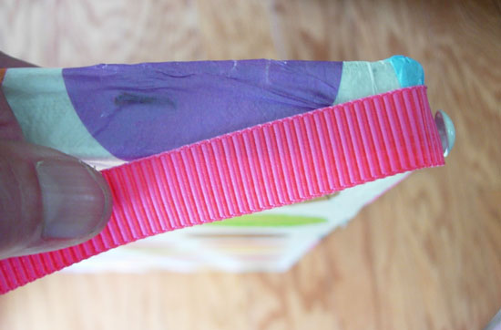 Starting at one corner, place one end of ribbon and press the furniture nail into the ribbon and frame. Don’t hammer this all the way in yet, as you will have to place the opposite end of the ribbon under this end once you place the ribbon all around the frame and the ends meet up. Then you can place this nail head in permanently.