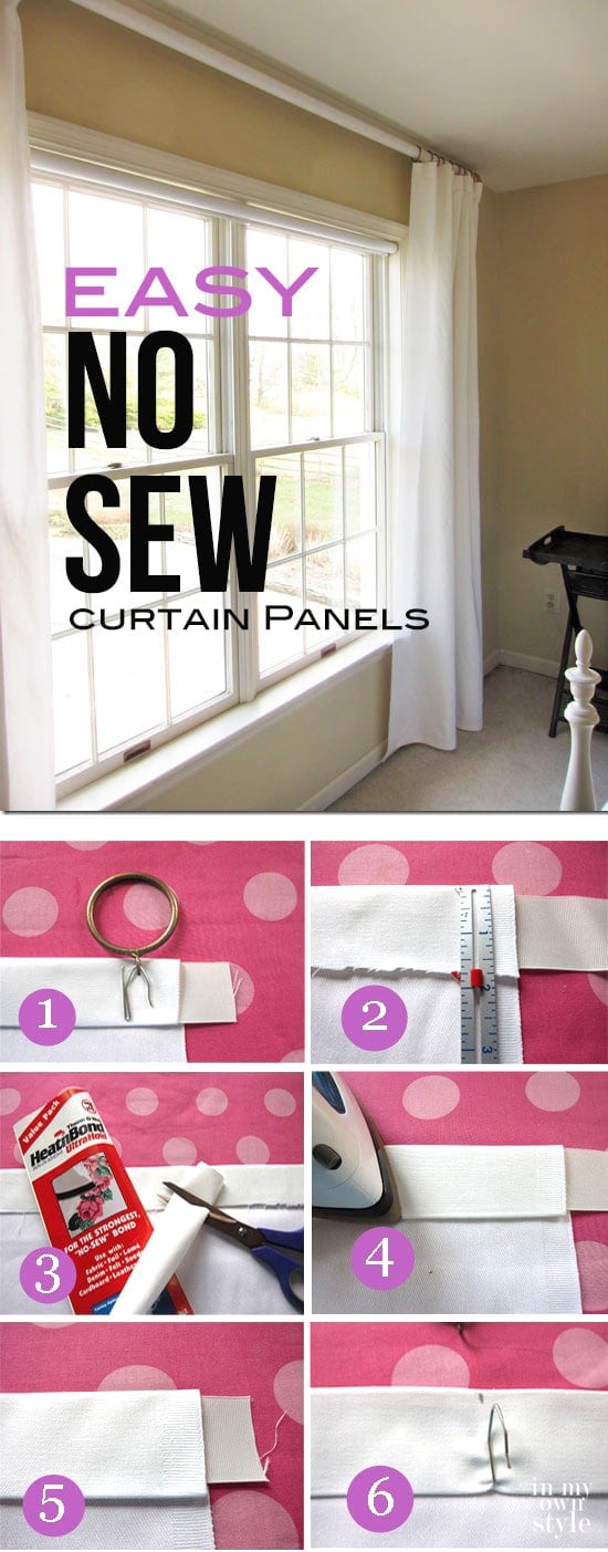Good ideas about no-sew curtain options. But I do want to advise that the “glue on” style tape applied with an iron does not always work on every fabric..sigh (: