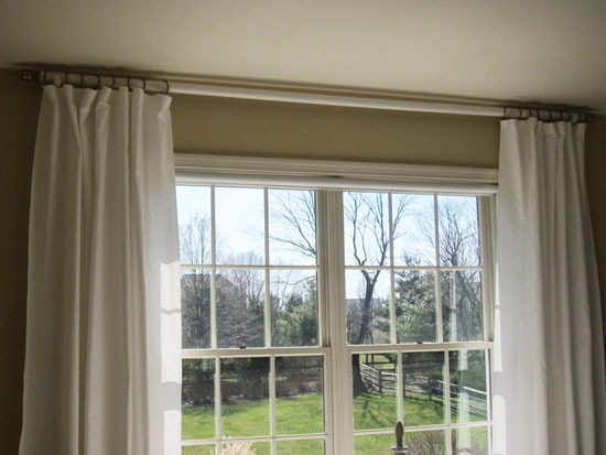 - Use drapery hooks attached to the back of the curtain and place the ends into with drapery rings. (above photo)