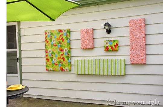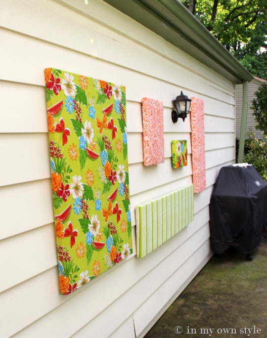 I like the basic concept idea but these patterned tablecloths area little too “60’s” for my taste. But what a great idea to hang up outside wall art!