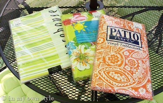 I don’t live near a Home Goods…but there is a Dollar General close by—and they have really cute vinyl table cloths….These would be cute on my pool deck!