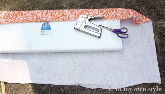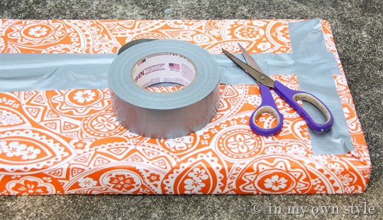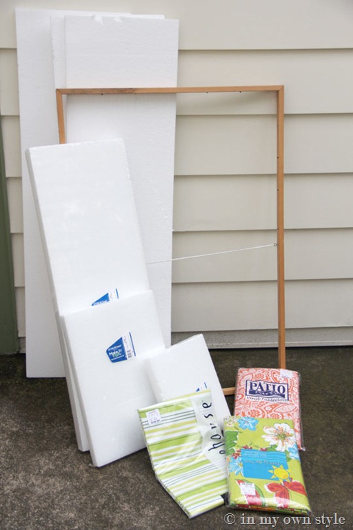 In my haste to get this done before it started raining, I didn’t get a photo showing how to staple the tablecloth around the wood frames. It is basically the same as wrapping it around the foam, but you do not need duct tape – just staples. *You can see a similar method in this post.