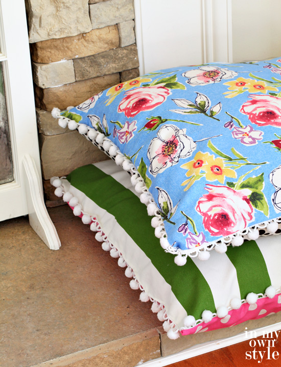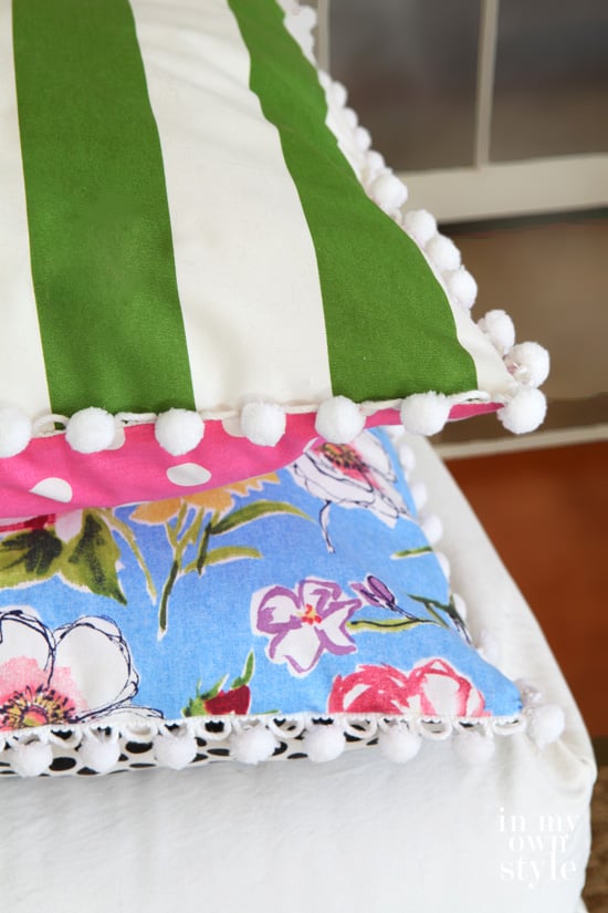 I made the pillows using scraps of fabric I had left over in my basement stash. I picked out the most colorful and festive scraps and used two different patterns on each pillow. I added the pom-pom trim to make them FUN!