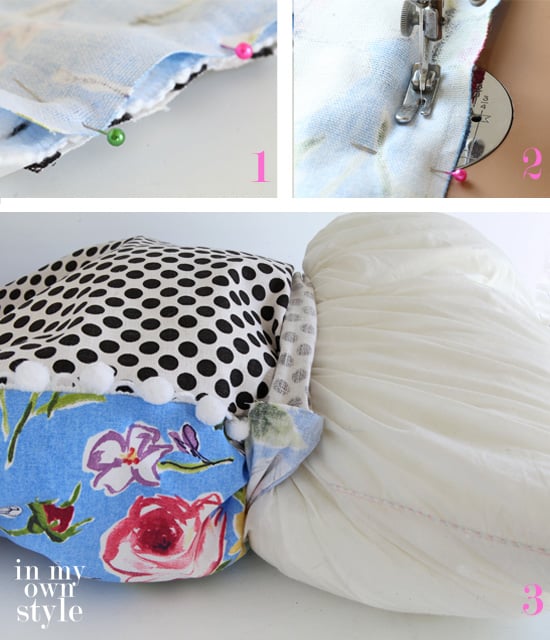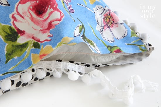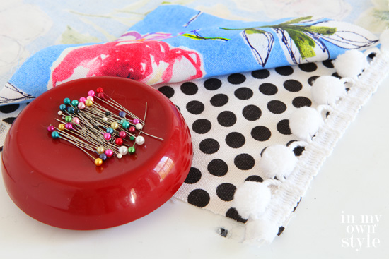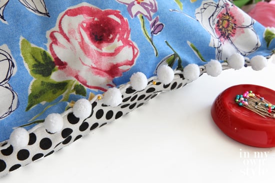 4. To close the opening: Fold over the edge of each side of fabric 1/2″ and place the pom-pom trim between the folded edges.