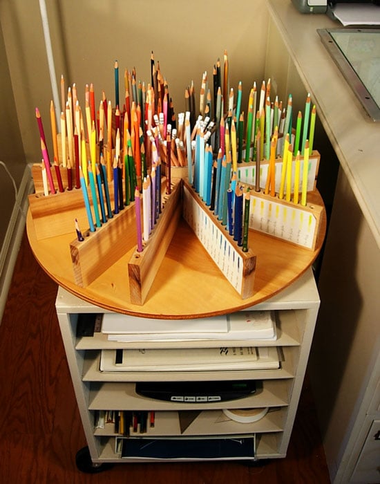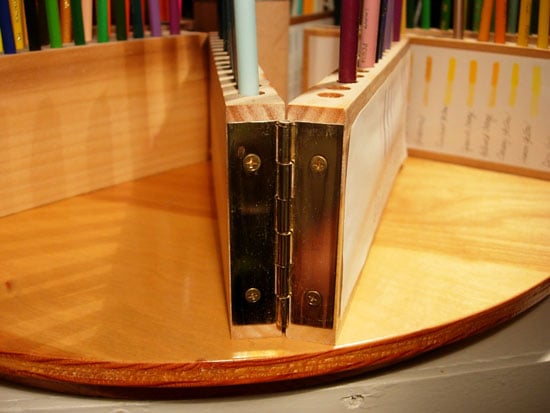 Four of these V sections fit nicely on top of a 21″ Lazy Susan that turns for easy access to pencils and small tools (erasers, etc.) stored in the V of each section.