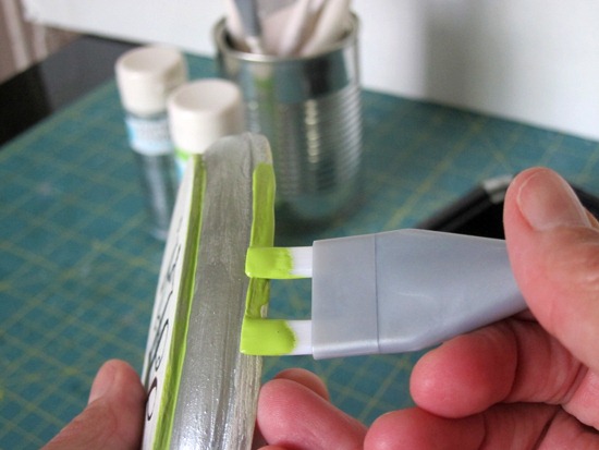 8. Using the long pointy tipped brush, paint the sides of the plaque. I used the Metallic finish in Sterling. I needed 3 coats and let each coat dry before adding the next coat.