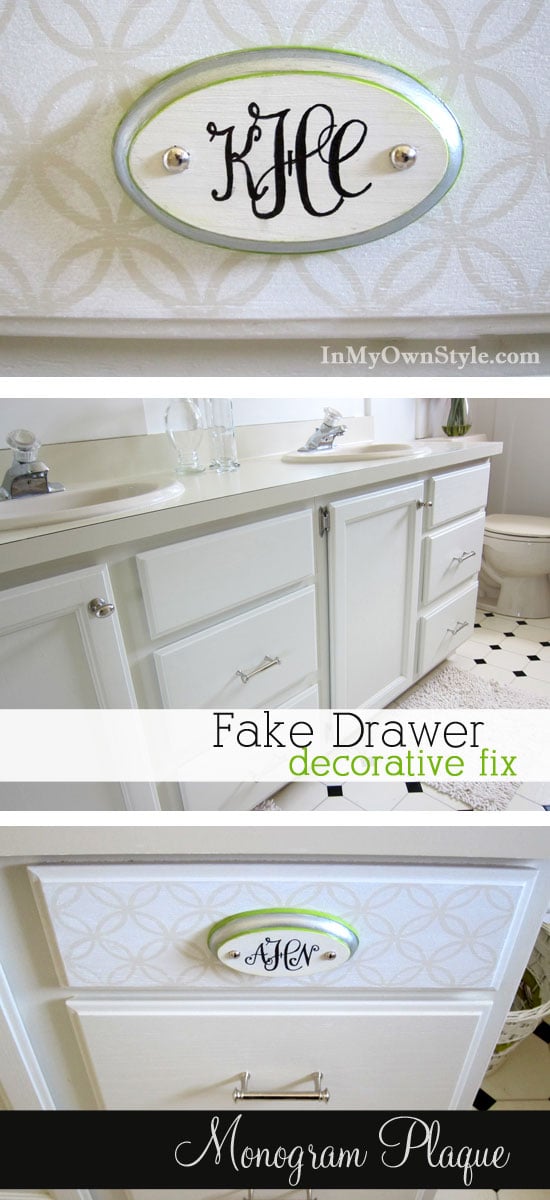 This is a bathroom that my used to daughters share. I stenciled a design on each top drawer and made a monogrammed plaque for each with their initials.