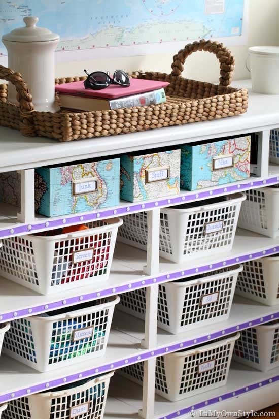 I love those baskets. Congratulations on making ugly plastic look nice I didn’t know it was possible I might have to try this the only thing I wouldn’t like it that it is exposed to everything else such as dust and you would still have to go in there and clean each basket out. Love the map touch