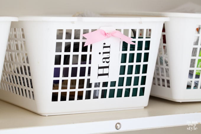 To add a bit of personality to the classic white tag style labels I made, I used pink grosgrain ribbon to tie each label to a basket. Just a little detail that makes me smile. In my mind, adding a touch of pink to just about anything is always a good thing.