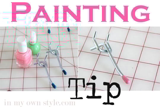 I wanted to change the blue tips that were on some of the hooks, so I went into my daughters’ stash of nail polish. I picked pink and green. I dipped each blue tip on the hooks into the nail polish and let it dry. Now I have colors that coordinate with the room. Easy!